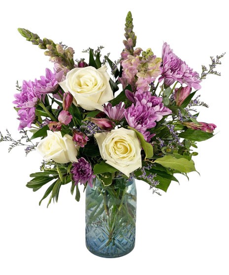 A fresh, uplifting mix of white roses, lavender mums, lavender snapdragons, and delicate purple accents arranged in a shimmering blue vase. This design feels joyful and serene all at once—an elegant way to celebrate Mom’s love, beauty, and the light she brings to every day.