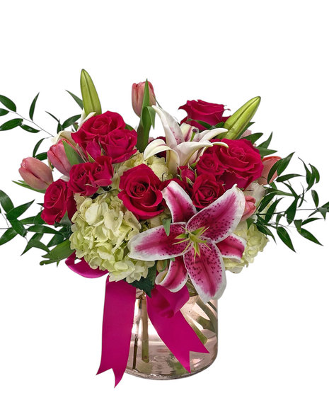 A joyful mix of roses, lilies, tulips, and hydrangea arranged in a clear vase and tied with a pink ribbon—an uplifting way to celebrate Mom’s love and beauty.