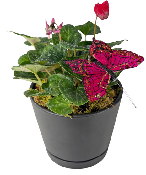 This 4 - inch cyclamen a charming blooming plant accented with a delicate pink butterfly, bringing a soft touch of color and joy to any space. Lush green foliage and vibrant blooms make it a sweet, uplifting gift or décor piece.