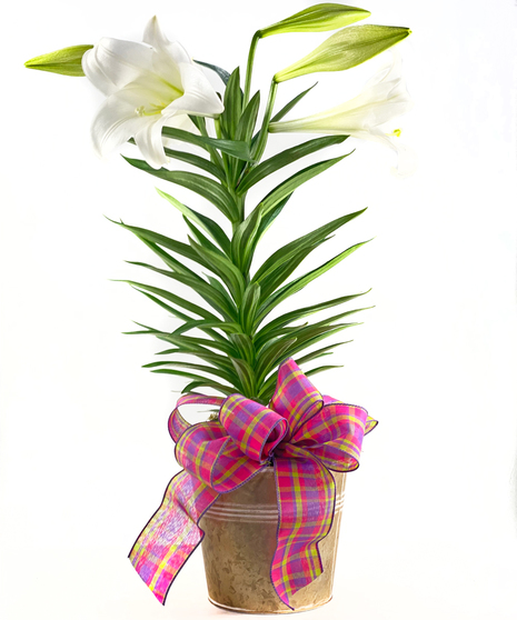 An Easter Lily from Shirley's Flower Studio in Rogers, AR, carries the essence of the season's renewal and hope directly to your doorstep. The radiant bloom, with its trumpet-shaped flowers, heralds the arrival of Spring and embodies the purity and joy of Easter. As a traditional symbol of the resurrection, the Easter Lily is a poignant reminder of new beginnings and the promise of brighter days. Presented in a classic pot adorned with a vibrant pink and yellow plaid ribbon, this Easter Lily plant brings a festive spirit to any space. The bow adds a playful touch to the plant's natural elegance and nods to the colorful eggs and dresses that often accompany the holiday. Gifting this lily is more than just a seasonal gesture; it's a way to connect with loved ones and share in the collective spirit of Easter. Whether it graces a church altar, a family dinner table, or a quiet corner in a friend's home, this lily from Shirley's Flower Studio is a beautiful testament to its dedication to quality and a customer's desire to convey heartfelt sentiments.