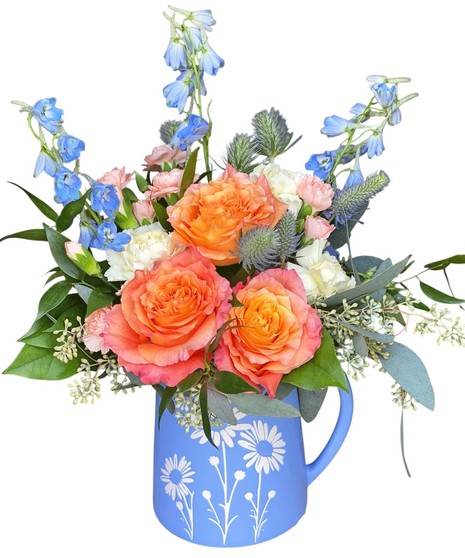 Bright, cheerful, and full of Southern charm, Sweet Tea & Marmalade brings together vibrant orange roses, creamy carnations, and airy blue delphinium in a keepsake blue pitcher etched with delicate daisies. This uplifting mix feels like sunshine on the porch—fresh, sweet, and made to brighten Mom’s day.